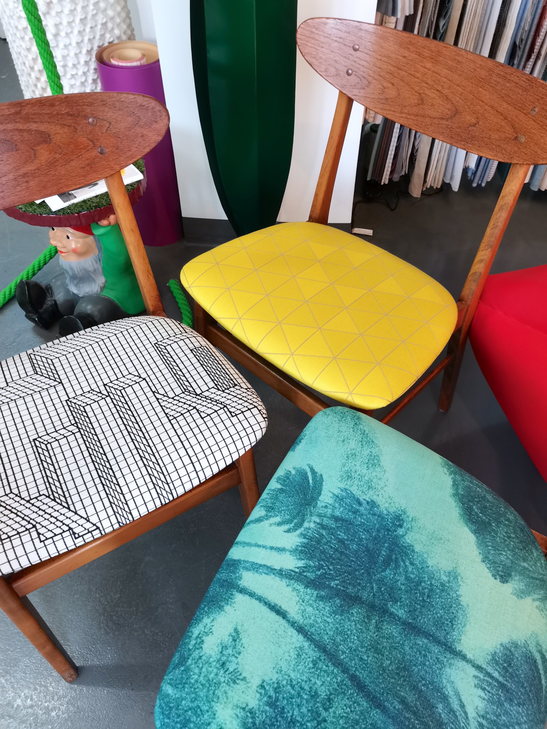 Chaises Farstrup, tissu Elitis x Studiopepe – réf: Zoe (Ecriture architecturale) OD 128 80, tissu Matthew Williamson – réf: Cocos F6636-01 et tissu Lelièvre – réf: Nasse citron 0712-05